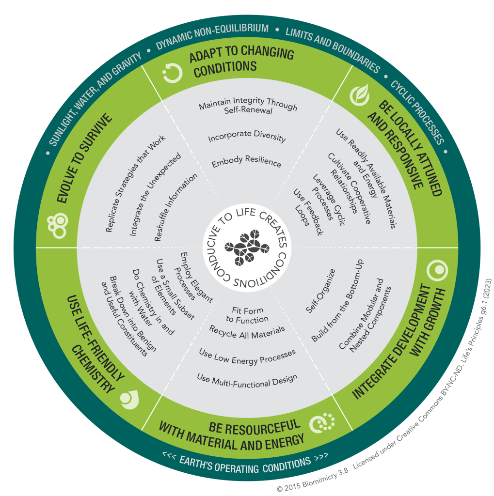 Nature Positive Practices are inspired by Life’s Principles, a body of work translating operating guidelines from nature, created by Dayna Baumeister and her team at Biomimicry 3.8. At the center lies the inspiration from Janine Benyus that “Life creates conditions conducive to life.” By learning and leading from the long-evolved systems within the natural world, we too can create conditions conducive to life, and to a thriving, regenerative future. Quoting Nicole Miller, director of B3.8’s Project Positive initiative, “It’s time we learn from nature, for nature.”